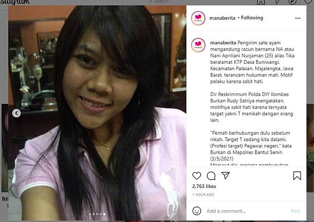 Kepada penyidik, pelaku na (nani aprilliani) kesal dan sakit hati karena si penerima tidak menikahinya. Pelaku salah sasaran hingga membaut anak driver ojol meninggal. Sianida ditaburkan di dalam bumbu sate itu, sehingga dari peristiwa ini dapat kita simpulkan bahwa ini sudah dirancang, tidak pada saat itu, tapi dirancang beberapa hari atau minggu sebelumnya. Gelagat wanita pengirim sate sianida di bantul disorot setelah beraksi. Wanita pembuat sate beracun sianida ditangkap (instagram/@tante_rempong_offficial).